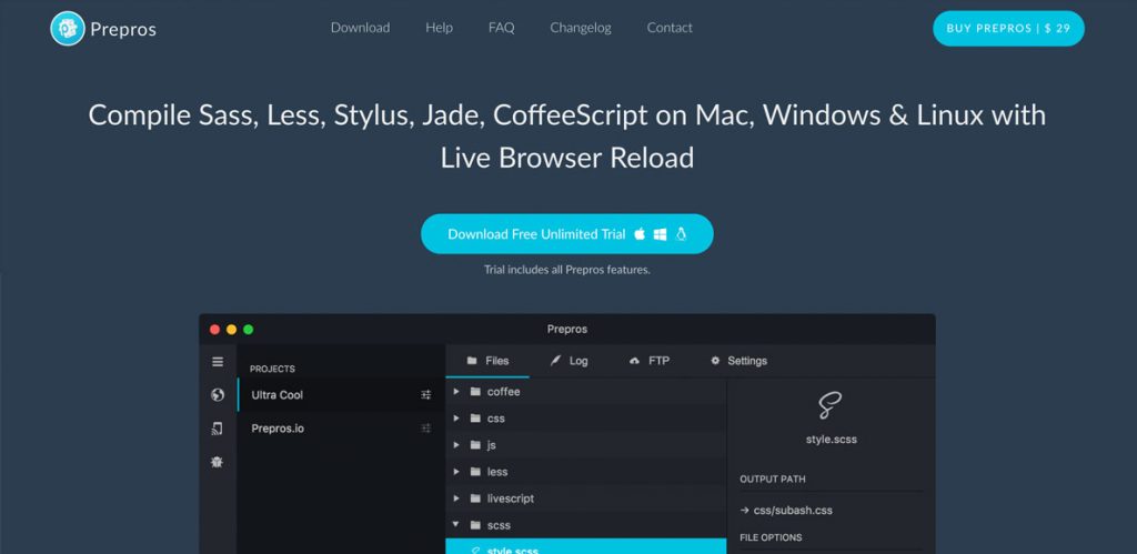 Prepros es elegible para compilar casi todos los lenguajes de preprocesamiento como Sass, Less, Stylus, Cssnext, Jade / Pug, Markdown, Slim, CoffeeScript y más.